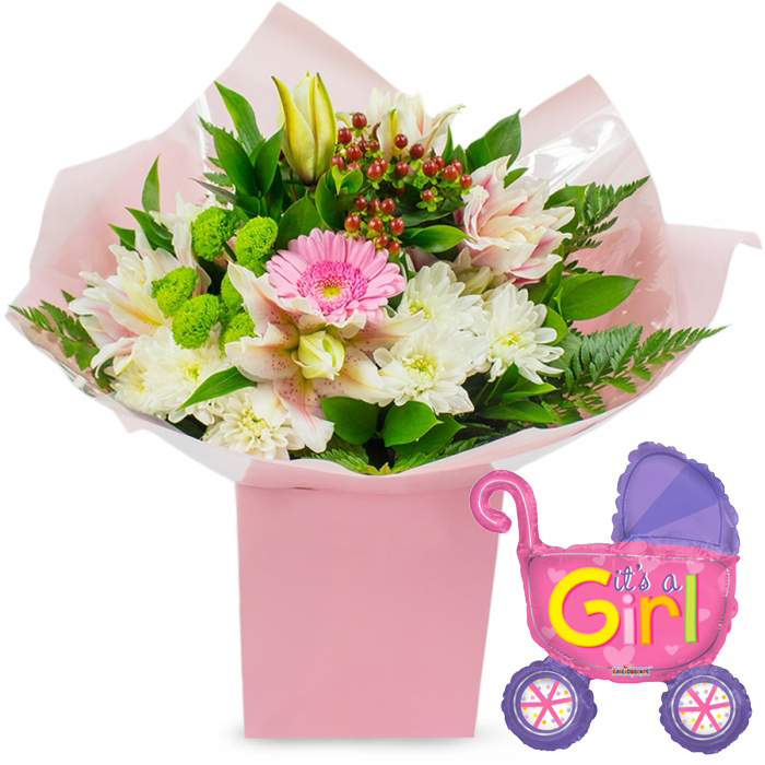 Celebrate the arrival of a newborn baby girl with a glamorous selection of pink and white blooms, featuring gerberas, rose lilies and chrysanthemums. Say congratulations to the happy family in a way that they will truly appreciate. The bouquet is combined with a lovely baby girl balloon to express your warmest wishes.