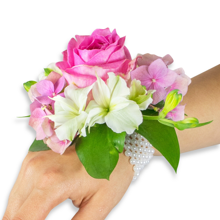 Brighten your special day with our Pretty in Pink Rose Corsage. This radiant arrangement showcases vibrant pink roses, lush hydrangeas, and delicate white alstroemeria, all hand-selected to guarantee peak freshness.